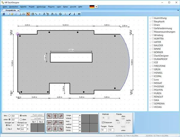 Mit dem MF DachDesigner zeichnen Sie technische Dachmodelle mit echten Dachaufbauten. Anstelle von Linien zeichnen sie Wandanschlüsse oder Dachränder, Punkte werden zu Gullys etc. Das Dachmodell bildet die Grundlage für technische Berechnungen, wie Gefälledämmung, Windsog, Bauphysik und Dachentwässerung. Auch die automatisierte Erstellung von Aufmaßen und Angeboten ist möglich.